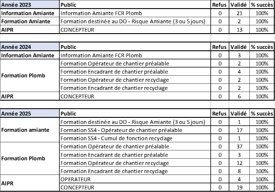 3 Formateurs – 21 sessions programmées - 102 stagiaires formés – 100% de taux de réussites – 100 % de